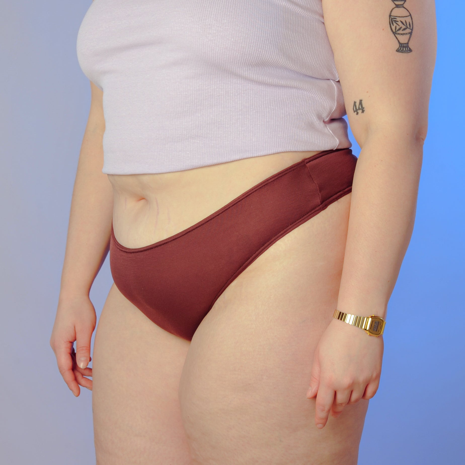 The gusset is made out of 60% organic cotton and 40% banana fabric, originated from India.
